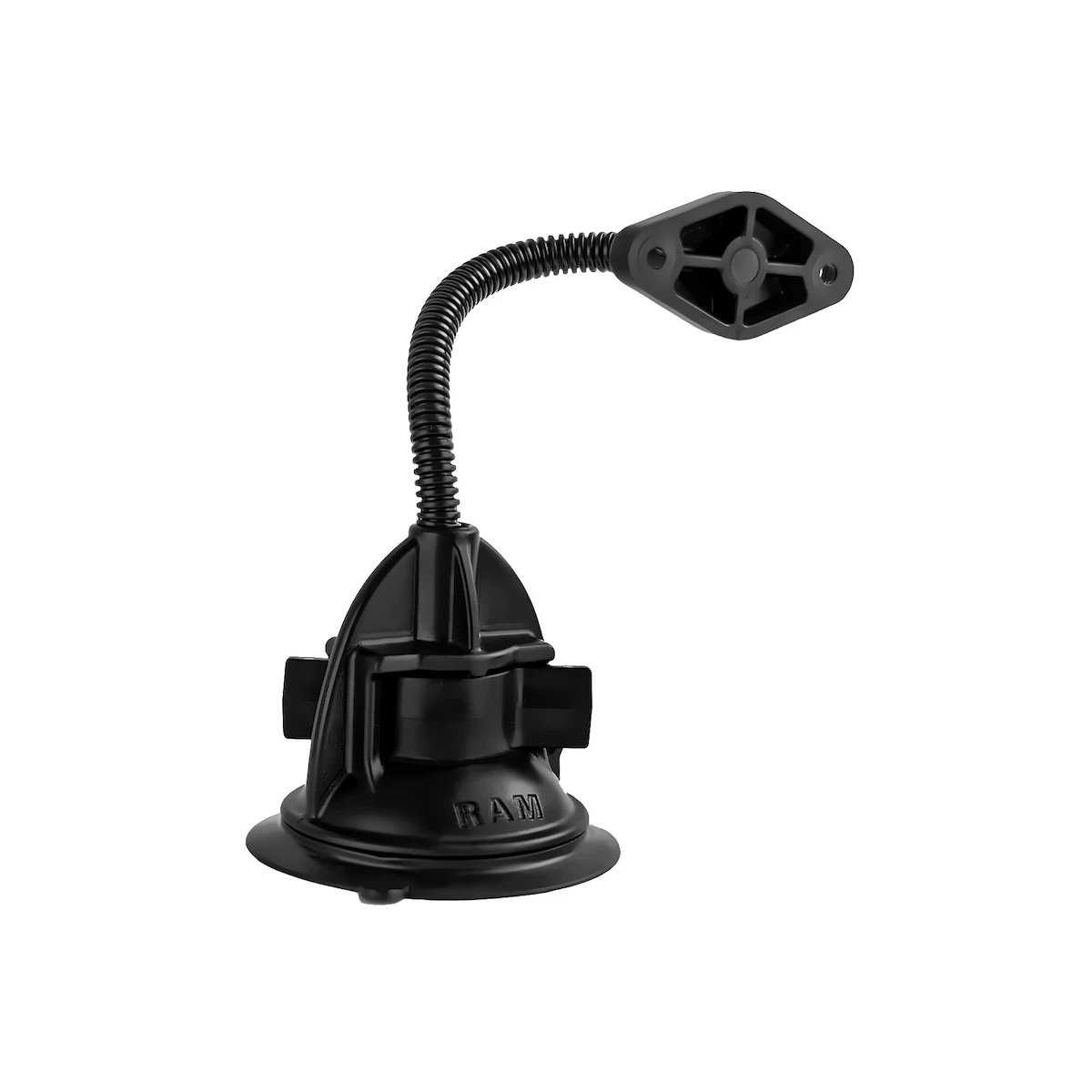The RAP-105-6D224U consists of a 3.3″ suction cup locking base, 6″ flex arm and diamond base end. The suction cup base is designed to have a strong hold on glass and non-porous plastic surfaces, including RAM adhesive disks. The hole pattern found on the diamond base adapter will connect to most RAM cradles.