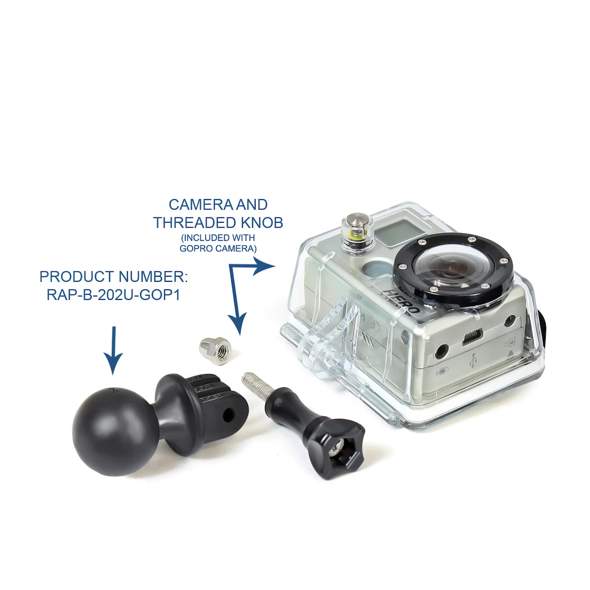 The RAP-B-202U-GOP1 consists of a 1″ diameter rubber ball, connected to a custom GoPro® adapter. The adapter attaches directly to the under-side of the camera, replacing the factory mounting bracket.