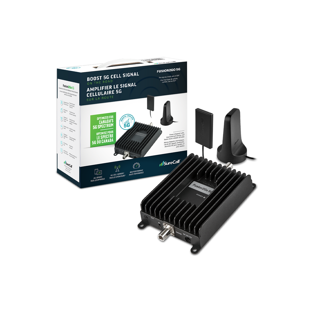 The SureCall Fusion2Go 5G booster is Canada’s highest performing system designed to improve 5G, 4G and LTE cellular signals for multiple users and devices inside any car, truck, or SUV. Fusion2Go 5G boosts voice, text, and data speeds on all 5G and 4G phones for all Canadian carriers. It improves interior coverage and extends your cellular range to help you stay connected, make calls, and use apps where you couldn’t before. Enjoy faster downloads, easier streaming and longer battery life from your cell phone or cellular enabled device.